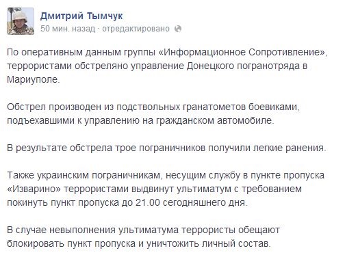 "В случае невыполнения ультиматума террористы обещают блокировать пункт пропуска и уничтожить личный состав", - написал Тымчук.