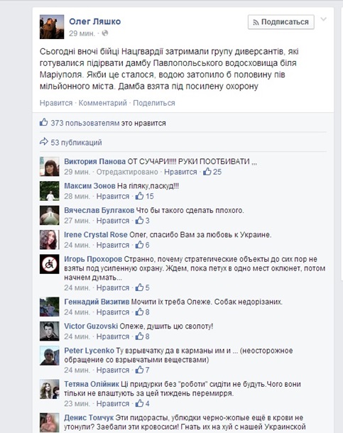 "Сегодня ночью бойцы Нацгвардии задержали группу диверсантов, которые готовились взорвать дамбу Павлопольского водохранилища Мариуполя. Если бы это произошло, водой затопило бы половину полмиллионного города", - сообщил нардеп.
