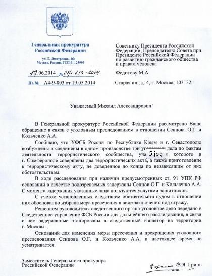 Генпрокуратура Российской Федерации не видит оснований для того, чтобы освободить украинского кинематографиста Олега Сенцова. Об этом сообщается в письме заместителя генпрокурора РФ Виктора Гриня, размещенном на сайте Совета при президенте РФ по развитию гражданского общества и правам человека.