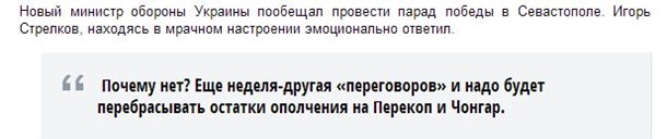 "Министр обороны" самопровозглашенной "Донецкой народной республики" Игорь Стрелков прокомментировал высказывание новоназначенного министра обороны Украины Валерия Гелетея о проведение военного парада в Крыму.