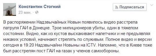 Видео убийства трех сотрудников ГАИ в Донецке, снятое на камеру, установленную в патрульной машине, опубликовал на своей странице в Facebook журналист Константин Стогний в пятницу, 4 июля.