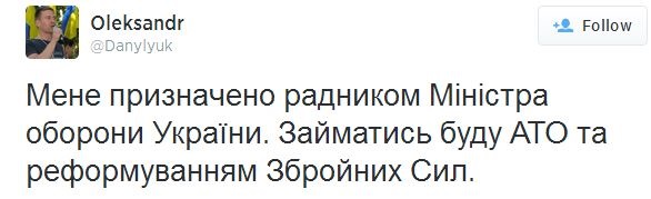 Министр обороны Украины Валерий Гелетей назначил своим советником общественного деятеля и координатора движения "Спільна справа" Александра Данилюка. Об этом Данилюк написал на своей странице в Twitter во вторник, 8 июля.