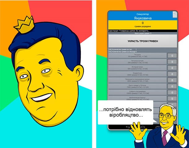 В марте этого года мобильное приложение про Януковича вышло в лидеры рейтинга Google Play. Игра «Симулятор Януковича» оказалась на четвертом месте в категории «топ бесплатных приложений». В игре предлагается стать президентом Украины и неминуемо вести ее к экономическому краху. В этом игроку будут помогать друзья Партии Регионов: Титушки, Антимайдановцы, Семья, Россия и другие.