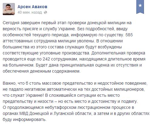 В понедельник, 14 июля, завершился первый этап проверки донецкой милиции на верность присяге и службу Украине. 585 аттестованных сотрудника милиции уволены. Об этом на своей странице в социальной сети Facebook сообщил министр внутренних дел Украины Арсен Аваков.