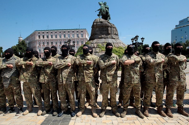 На Софийской площади в Киеве перед отправкой на войну на Донбасс приняли присягу на верность Украине новые добровольцы, которые пополнили ряды батальона Азов.