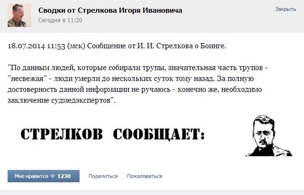 "Министр обороны" самопровозглашенной "Донецкой народной республики" со ссылкой на очевидцев утверждает, что часть трупов со сбитого малазийского Boeing-777 в Донецкой области "не свежая" и люди умерли за несколько дней до аварии. Об этом сообщается в группе Сводки от Стрелкова Игоря Ивановича в соцсети Вконтакте.