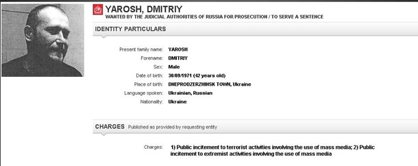Информация о розыске Дмитрия Яроша появилась на официальном сайте Интерпола в разделе о разыскиваемых лицах.