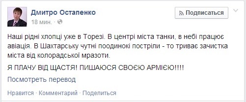 "Наши родные ребята уже в Торезе. В центре города танки, в небе работает авиация. В Шахтерске слышны одиночные выстрелы - то продолжается зачистка города от колорадской мразоты", - пишет уроженец Шахтерска Дмитрий Остапенко.