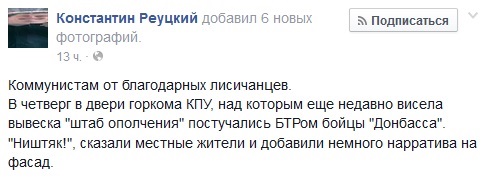 Луганский правозащитник Константин Реуцкий опубликовал в Facebook фото "разукрашенного" лисичанцами офиса местной КПУ. Как известно, Лисичанск Луганской области украинские военные освободили от сепаратистов на прошлой неделе. Также на прошлой неделе в парламенте Украины распустили фракцию Компартии.