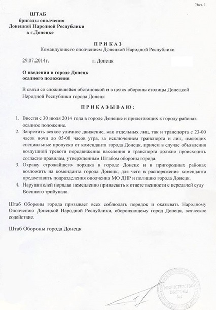 Кроме того в "приказе" говорится, что охрана строжайшего порядка в Донецке и в пригородных районах возложена на коменданта Донецка.