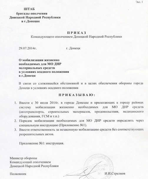 Согласно второго "приказа" Стрелкова О мобилизации жизненно необходимых для МО ДНР материальных средств в условиях осадного положения в Донецке "ополчение" будет "мобилизовать" автотранспорт, строительные материалы, продовольствие, медицинское оборудование и ГСМ (Горюче-смазочные материалы).