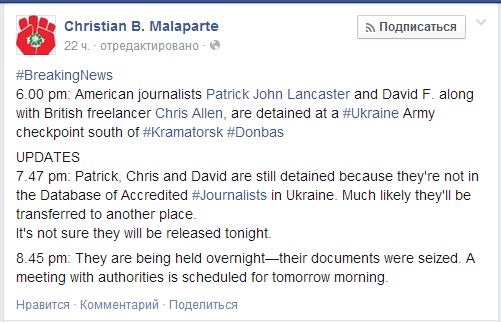Ранее итальянский блогер Кристиан Малапарте сообщил на своей странице в Facebook о задержании двух американских журналистов Патрика Джона Ланкастера и Дэвида Дж., а также фрилансера Криса Аллена из Великобритании на КПП украинских военных в Краматорске Донецкой области.