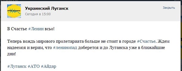 "Теперь вождь мирового пролетариата больше не стоит в городе Счастье. Ждем, надеемся и верим, что ленинопад доберется и до Луганска уже в ближайшие дни!", - пишут участники группы Украинский Луганск в социальной сети Вконтакте.