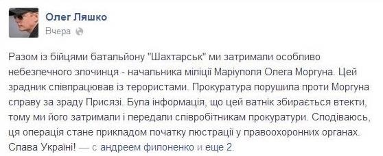 Позже на странице нардепа в Facebook появилась видеозапись, на которой показано задержание главы ГУ МВД Мариуполя. На ней Ляшко обвиняет Моргуна в предательстве Украины и сепаратизме.