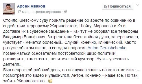 "Стоило Киевскому суду принять решение об аресте по обвинению в содействии терроризму Жириновского, Шойгу, Миронова и Ко и доставке их в судебное заседание – как тут же оборвал все телефоны Владимир Вольфович. Затрепетала беспокойная душа, занервничала, чувствует - мечется болезный.. Случай, конечно, клинический. Как то раз уже об этом писал, а сегодня попросил Anton Gerashchenko позаниматься основателем постсоветской шизо-политики, расширить, так сказать, политический кругозор. Ну и – урезонить деятеля.. Был непростой рабочий день, но послушал запись на автоответчике – посмотрел это видео и улыбнулся. Антон, конечно – наше все. Но так забить Жириновского.. ", - написал Арсен Аваков.
