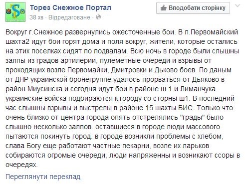 "Вокруг г.Снежное развернулись ожесточенные бои. В п.Первомайский шахта 2 идут бои горят дома и поля вокруг, жители, которые остались на этих поселках сидят по подвалам. Всю ночь в городе были слышны залпы из Градов, артиллерии, пулеметные очереди и взрывы от проходящих возле Первомайки, Дмитровки и Дьяково боев", - отмечается в сообщении группы.