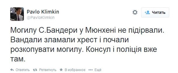 Министр иностранных дел Украины Павел Климкин опроверг информацию о взрыве могилы Степана Бандеры в Мюнхене. Об этом он написал в своем блоге в Twitter.