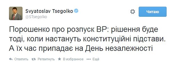 "Порошенко о роспуске ВР: решение будет тогда, когда наступят конституционные основания. А их время приходится на День Независимости", - написал Цеголко.