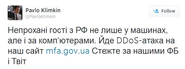 Министр иностранных дел Украины Павел Климкин сообщил, что на официальный сайт внешнеполитического ведомства осуществляется DDoS-атака. Об этом министр написал на своей станице в Twitter.