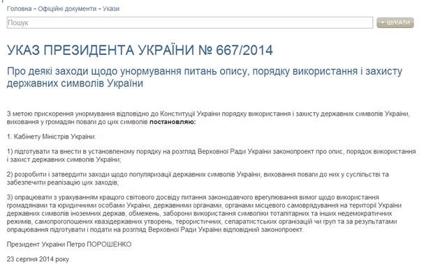 Соответствующий указ №667/2014 О некоторых мерах по нормализации вопросам описания, порядка использования и защиты государственных символов Украины, подписанный Порошенко сегодня, обнародован на сайте главы государства.