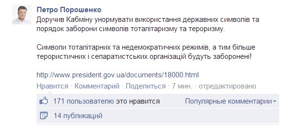 Президент Украины Петр Порошенко поручил правительству разработать порядок использования и защиты государственных символов страны, а также порядок запрета символов тоталитаризма и терроризма.