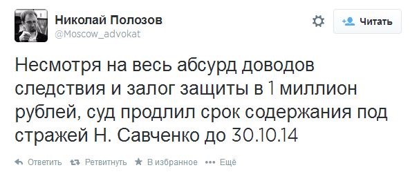 "Несмотря на весь абсурд доводов следствия и залог защиты в 1 миллион рублей, суд продлил срок содержания под стражей Н. Савченко до 30.10.14", - написал Полозов.