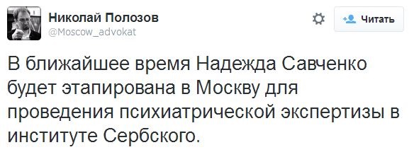 Полозов также сообщил, что суд отправил Надежду Савченко на стационарную психиатрическую экспертизу в Москву, где у адвокатов в течение месяца не будет к ней доступа.