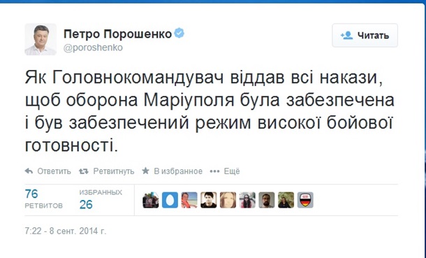 Президент Украины Петр Порошенко отдал приказ обеспечить режим высокой боевой готовности для обороны Мариуполя. Об этом он сообщил в своем Twitter.