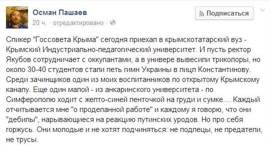 "Они молодые и не хотят подчиняться: не подлецы, не предатели, не трусы", - пишет журналист о студентах, спевших гимн Украины в Крыму.