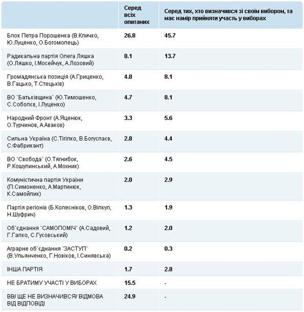 Также отмечается, что 46,3% опрошенных твердо намерены проголосовать на внеочередных выборах в Верховную Раду и 28,2% ответили, что вероятнее примут участие в голосовании. О твердом нежелании идти на выборы заявили 15,1% опрошенных. 10,4% респондентов отказались отвечать на вопросы.