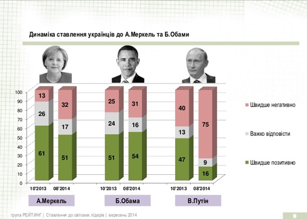 Президент Российской Федерации Владимир Путин возглавил рейтинг отрицательного отношения украинцев к мировым лидерам. В частности, к нему как к мировому лидеру негативно относятся 75% украинцев. Об этом свидетельствуют результаты соцопроса группы Рейтинг.