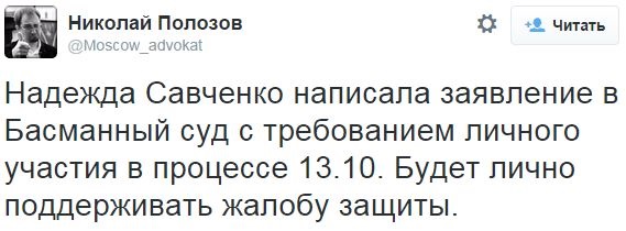 Украинская летчица Надежда Савченко намерена добиваться личного участия в судебном процессе и написала заявление в Басманный суд Москвы. Об этом в своем микроблоге в Twitter написал адвокат летчицы Николай Полозов.