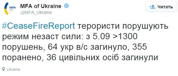 Незаконные вооруженные формирования более 1300 раз нарушили режим прекращения огня в зоне АТО. Об этом в микроблоге Twitter сообщило Министерство иностранных дел Украины в четверг, 9 октября.