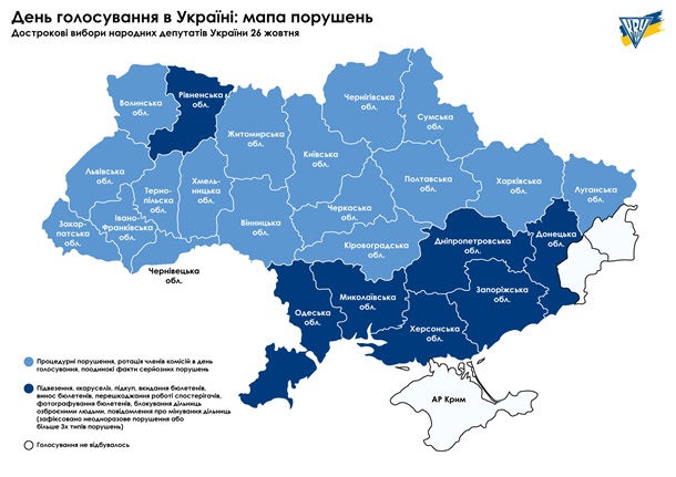 Больше всего нарушений было зарегистрировано на выборах в Донецкой, Днепропетровской, Запорожской, Херсонской, Николаевской, Одесской и Ровненской областях. Как сообщается, именно в этих областях наблюдатели зафиксировали более трех типов нарушений.