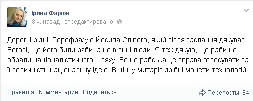 "Дорогие и родные. Перефразирую Иосифа Слепого, который после ссылки благодарил Бога за то, что его били рабы, а не свободные люди. Я тоже благодарю, что рабы не выбрали националистического пути. Ибо не рабское это дело голосовать за ее величество национальную идею. В цене у мытарей мелкие монеты технологий", - написала она.