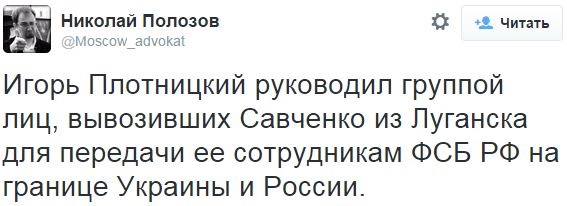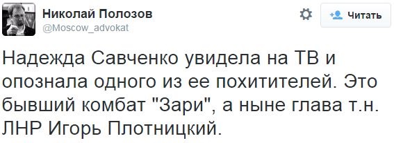 По его словам, Савченко опознала Плотницкого, увидев его по телевидению. И якобы именно под его руководством женщину передали сотрудникам ФСБ РФ на украинско-российской границе.