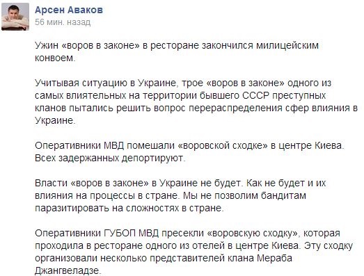 "Учитывая ситуацию в Украине, трое "воров в законе" одного из самых влиятельных на территории бывшего СССР преступных кланов пытались решить вопрос перераспределения сфер влияния в Украине. Оперативники МВД помешали "воровской сходке" в центре Киева. Всех задержанных депортируют", — написал Аваков.