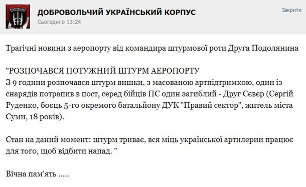 "Начался мощный штурм аэропорта. С 9 часов начался штурм вышки, с массированной артподдержкой, один из снарядов попал в пост, среди бойцов ПС один погибший - Друг Север (боец Север 5-го отдельного батальона ДУК "Правый сектор", житель Сум, 18 лет)", - говорится в сообщении.