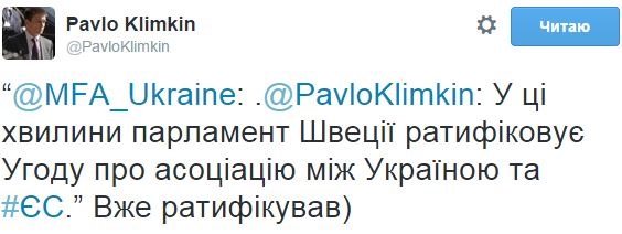 "В эти минуты парламент Швеции ратифицирует Соглашение об ассоциации между Украиной и ЕС", - написал Климкин.