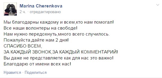 "Мы благодарны каждому и всем, кто нам помогал! Все наши волонтеры на свободе! Нам нужно передохнуть, много всего случилось", – написала она.