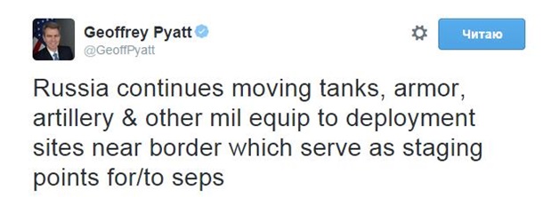 “Россия продолжает стягивать к границе танки, бронетехнику, артиллерию и другое военное оборудование“, - написал Пайетт в Twitter.