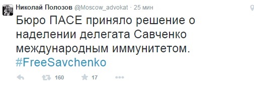 “Бюро ПАСЕ приняло решение о наделении делегата Савченко международным иммунитетом“, – написал Полозов.