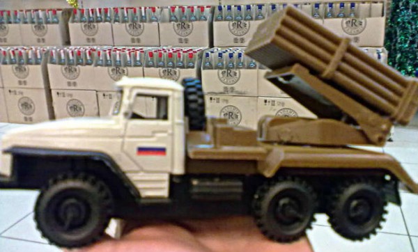 В магазинах продаются игрушечные модели реактивных систем залпового огня Град, грузовиков Урал, российских танков, БМП и другой техники с флагами РФ