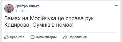 "Покушение на Мосийчука - это дело рук Кадырова", - написал он в Facebook.
