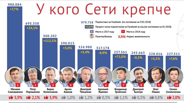 И в самом деле, почему Саакашвили при провальной кампании осенью-зимой 2017 года имеет самый длинный список фолловеров? Почему слабо «слышат» топовых блогеров-политиков (Авакова, Тимошенко, Ляшко)?