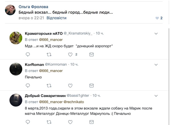 “На фотографиях когда-то современный вокзал теперь напоминает локации для съемок фильмов про зомби. Окна здания выбиты, внутри лужи, а вокруг ни души. Видимо, новые “власти“ Донецка решили не восстанавливать здания вокзала из-за фактического отсутствия железнодорожного сообщения в “республике““, - пишет издание.