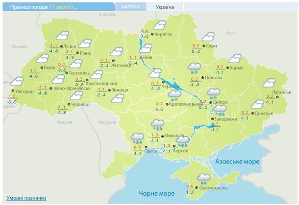 В Украине в воскресенье, 11 февраля, ожидается пасмурная погода, на юге, в некоторых центральных и восточных областях пройдут дожди со снегом, сообщает Гидрометцентр.