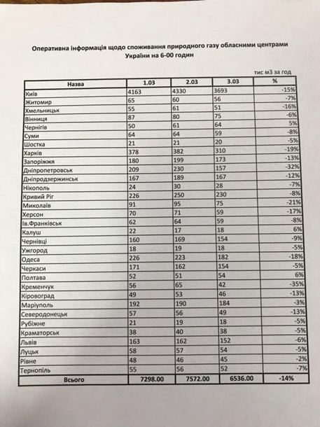 Глава Нафтогаза Андрей Коболев опубликовал данные об экономии газа по всей Украине. Соответствующее фото он прикрепил к посту на своей странице в Facebook.