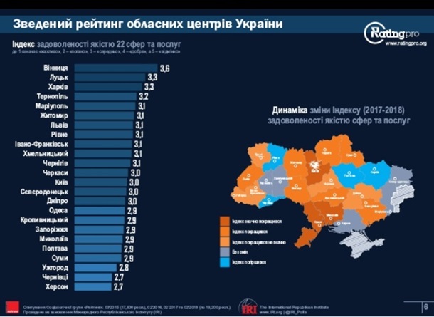 Выведя среднюю оценку по ответам респондентов, социологи составили рейтинг, в котором на первом месте Винница с оценкой 3,6. С оценкой 3,3 второе место разделили Луцк и Харьков. Наихудшую оценку - 2,7 - получили Херсон и Черновцы. Столица стала троечницей с индексом удовлетворенности 3,0.