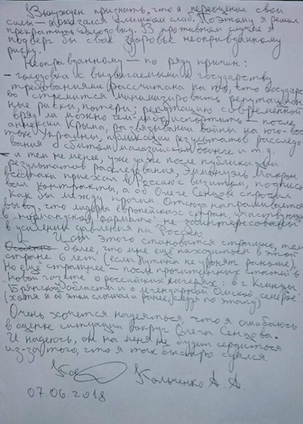 Также Лепехин опубликовал письмо Кольченко, в котором он попросил прощения у Сенцова за то, что так быстро сдался.